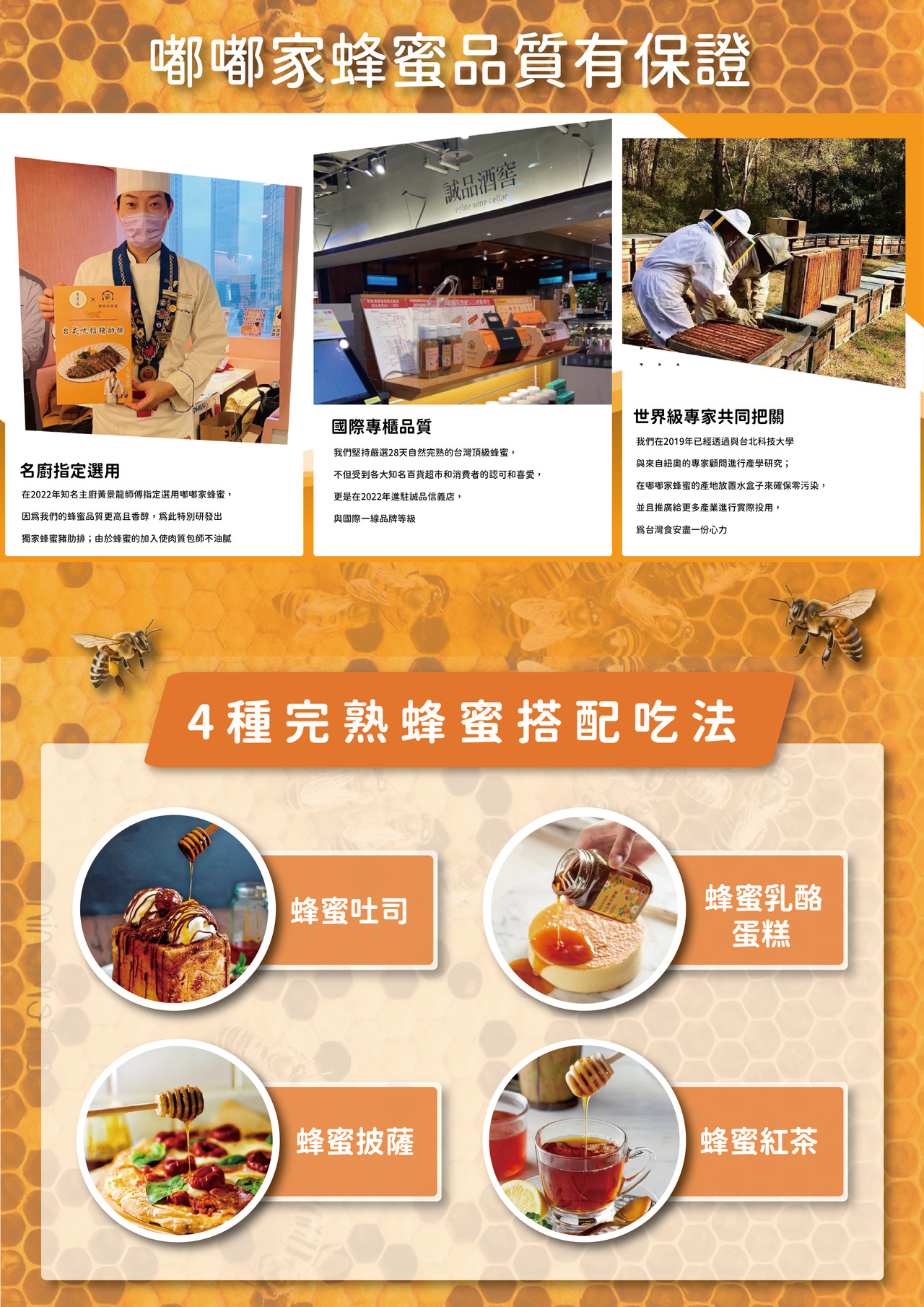 ※ 蜂蜜結晶屬自然現象,如遇結晶,請放心食用,可直接當作抹醬食用,或隔水加熱40度以下即可還原。