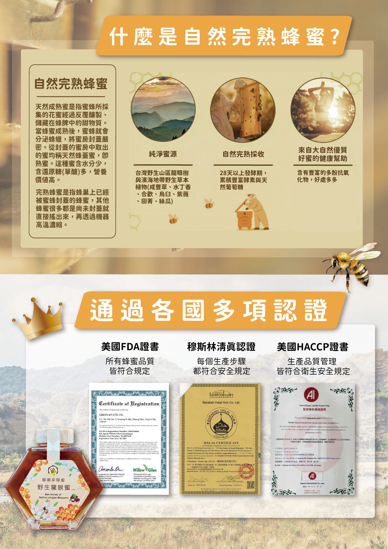 ※ 蜂蜜結晶屬自然現象,如遇結晶,請放心食用,可直接當作抹醬食用,或隔水加熱40度以下即可還原。